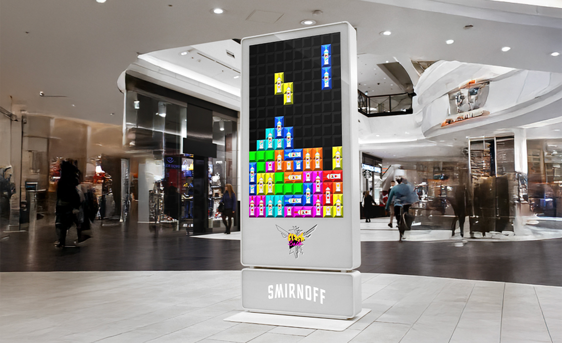 Smirnoff branded version of throwback games such as tetris and minesweeper will be playable on interactive displays in malls and some bars and participants can earn discounts and other prizes.