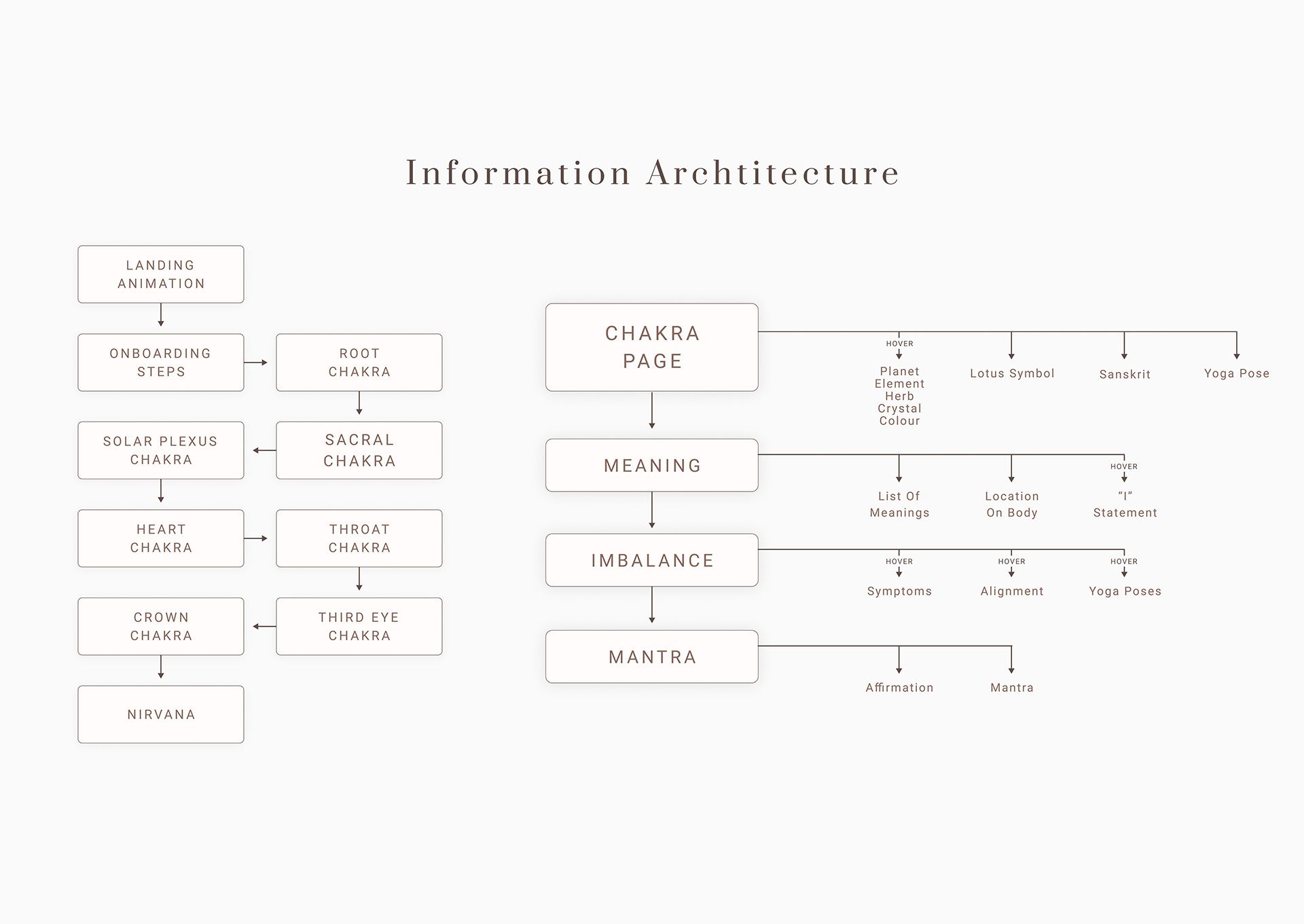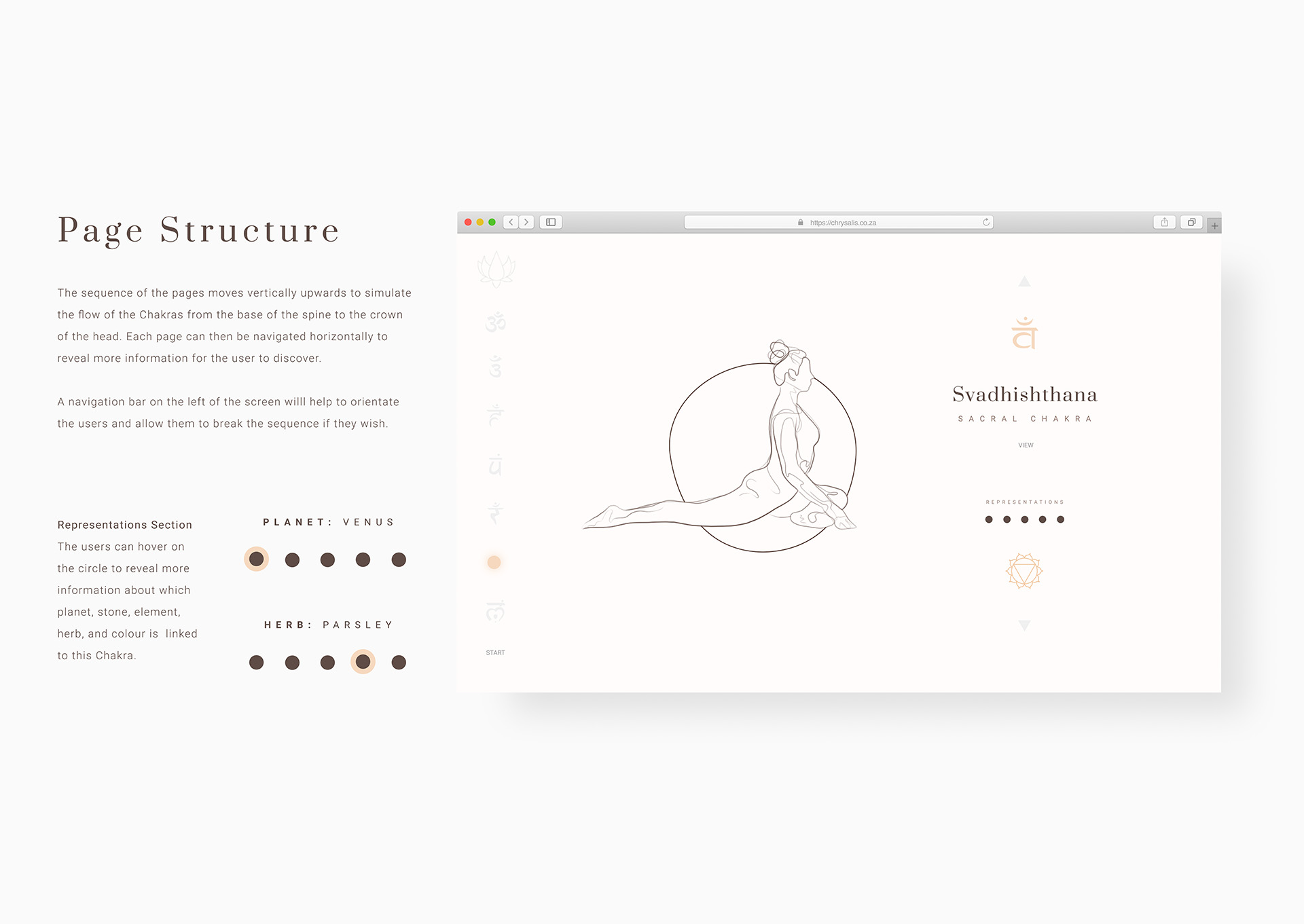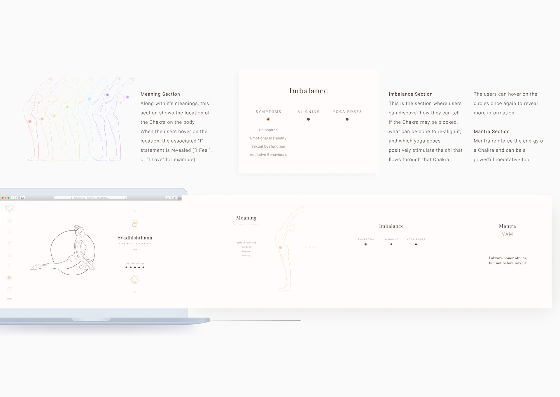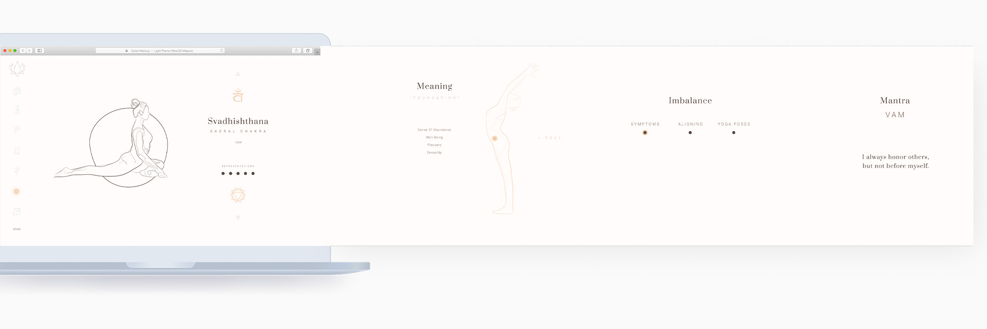 This project flows vertically, mirroring the upward journey of energy through the Chakras, from the base of the spine to the crown of the head. Users can explore each section further by navigating horizontally, uncovering layered information in an intuitive and immersive experience. A thoughtfully designed navigation bar offers flexibility, allowing users to follow or break the sequence seamlessly. The user experience was crafted to balance simplicity and clarity with a unique, visually engaging journey.